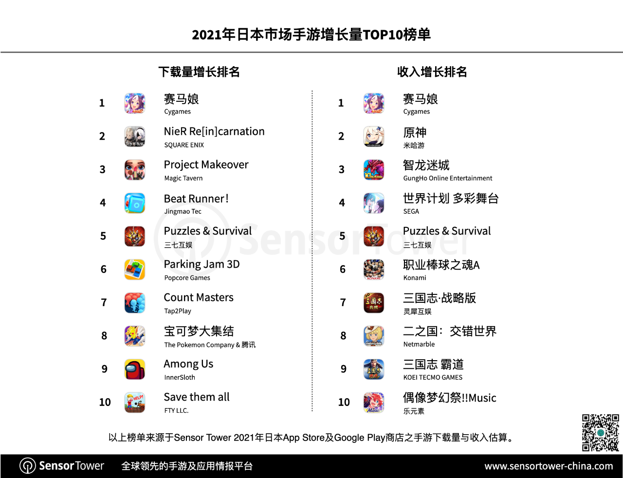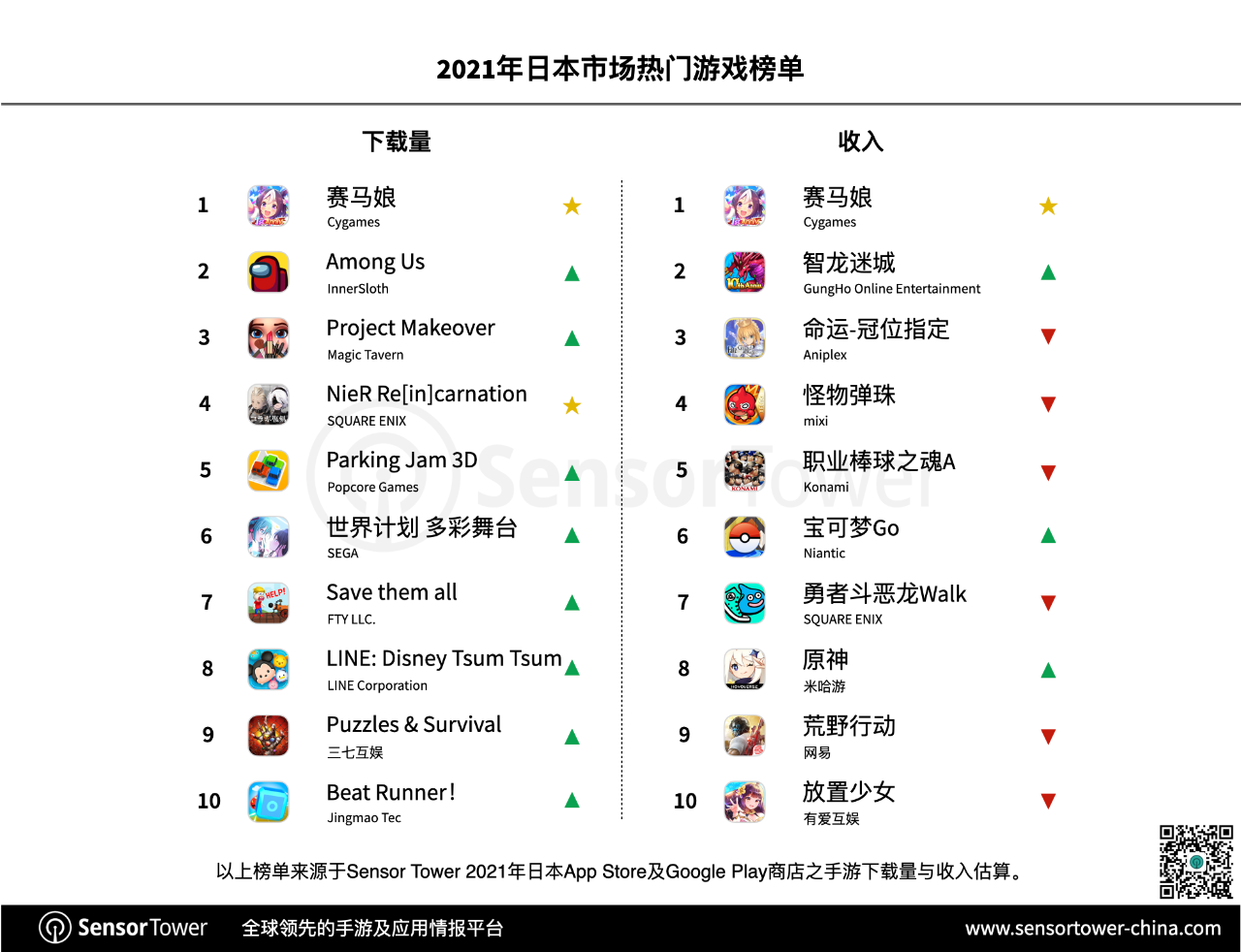 2021年日本下载榜Top10除《赛马娘》与《 NieR Re[in]carnation》两款新游之外,其他游戏均是初次进入年度榜单前十,由此显示出日本商场汹涌的竞赛态势。